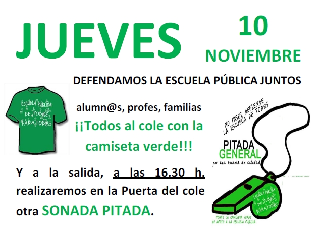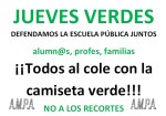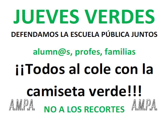 También os informamos que las AMPA´s de Sanse hemos decidido DECLARAR LOS JUEVES DÍAS VERDES, es decir los jueves todos (padres, madres, niños y profesores) tenemos que ir con la camiseta verde. Si alguno todavía no la tiene en el AMPA hay.