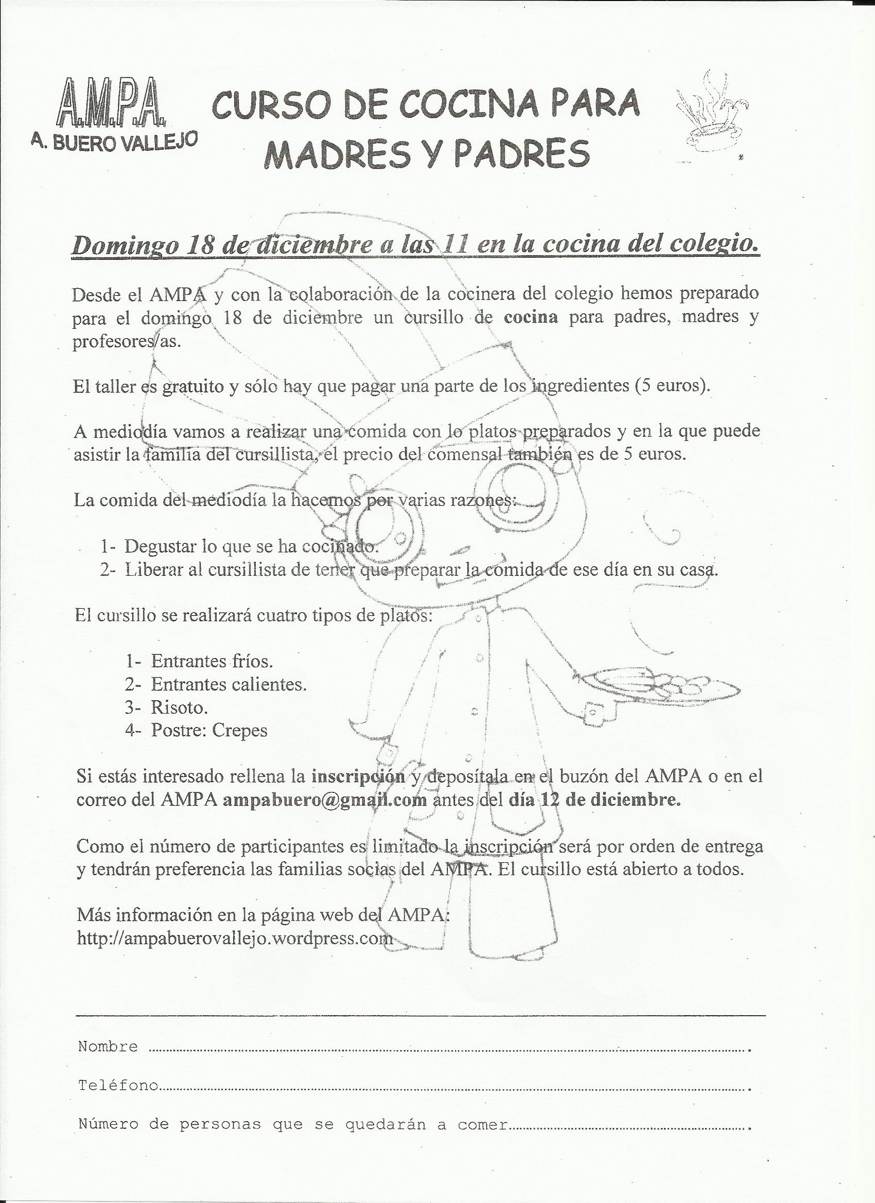 La AMPA, con la colaboración de la cocinera del colegio, ha organizado un curso de cocina, el próximo domingo día 18 de
