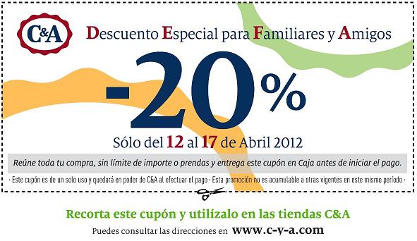 Descuentos: Se está intentando buscar ofertas que hagan más llevadera la crisis económica que nos ha tocado vivir. Por eso os entregamos este vale descuento del 20% que nos ha enviado la empresa C&A. Seguiremos buscando ofertas y descuentos que puedan servir a las familias de nuestro colegio, ya sea a través de la tarjeta de la FAPA, o bien a través de nuestra asociación directamente.