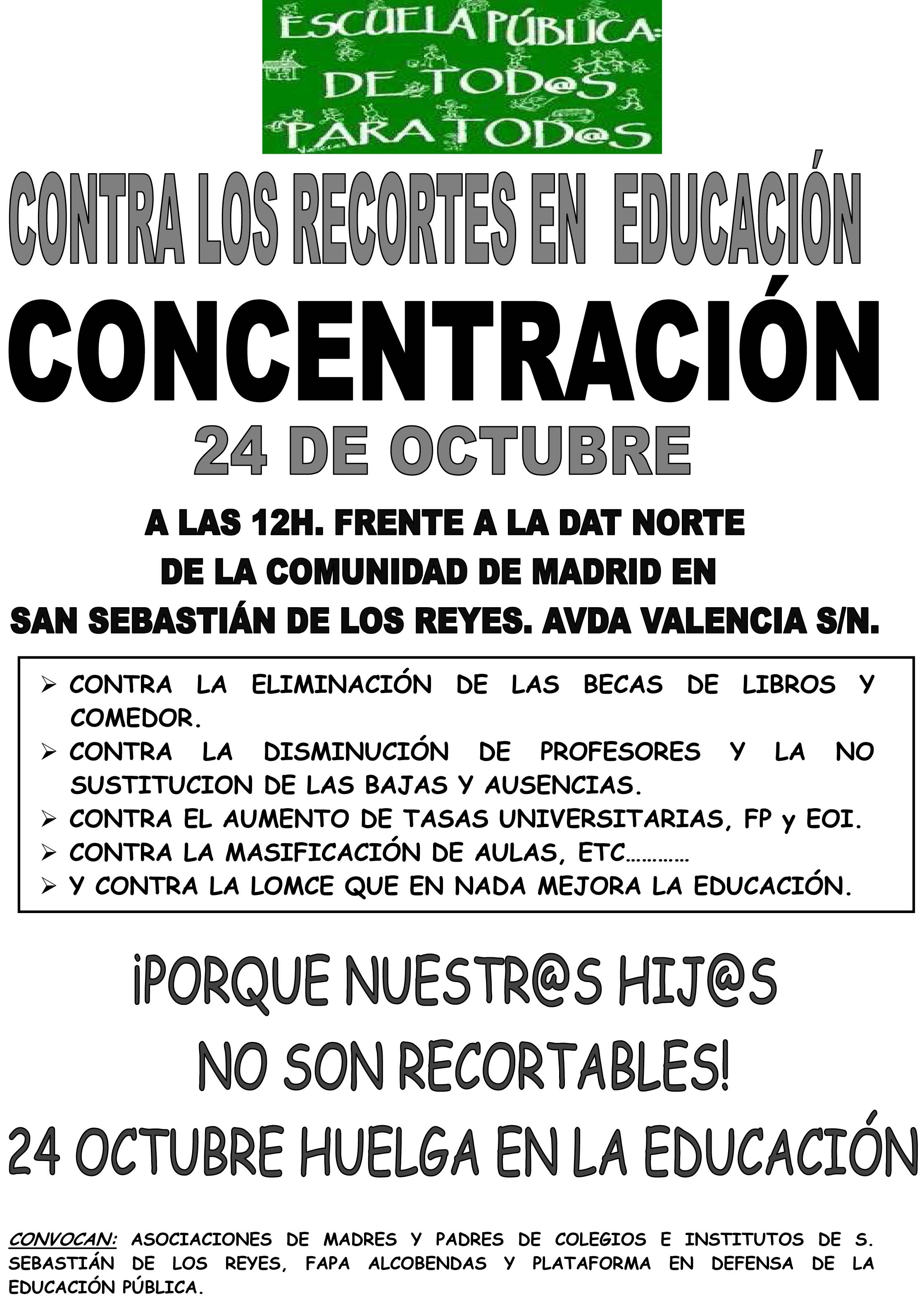La Plataforma Estatal por la Defensa de la Escuela Pública, en la cual está integrada la Confederación Española de Asociaciones de Padres y Madres de Alumnos (CEAPA) convoca una Huelga General de la Educación el próximo 24 de Octubre, en toda la comunidad escolar (profesorado, alumnado, familias y personal de los centros), desde la etapa de infantil hasta la universidad.