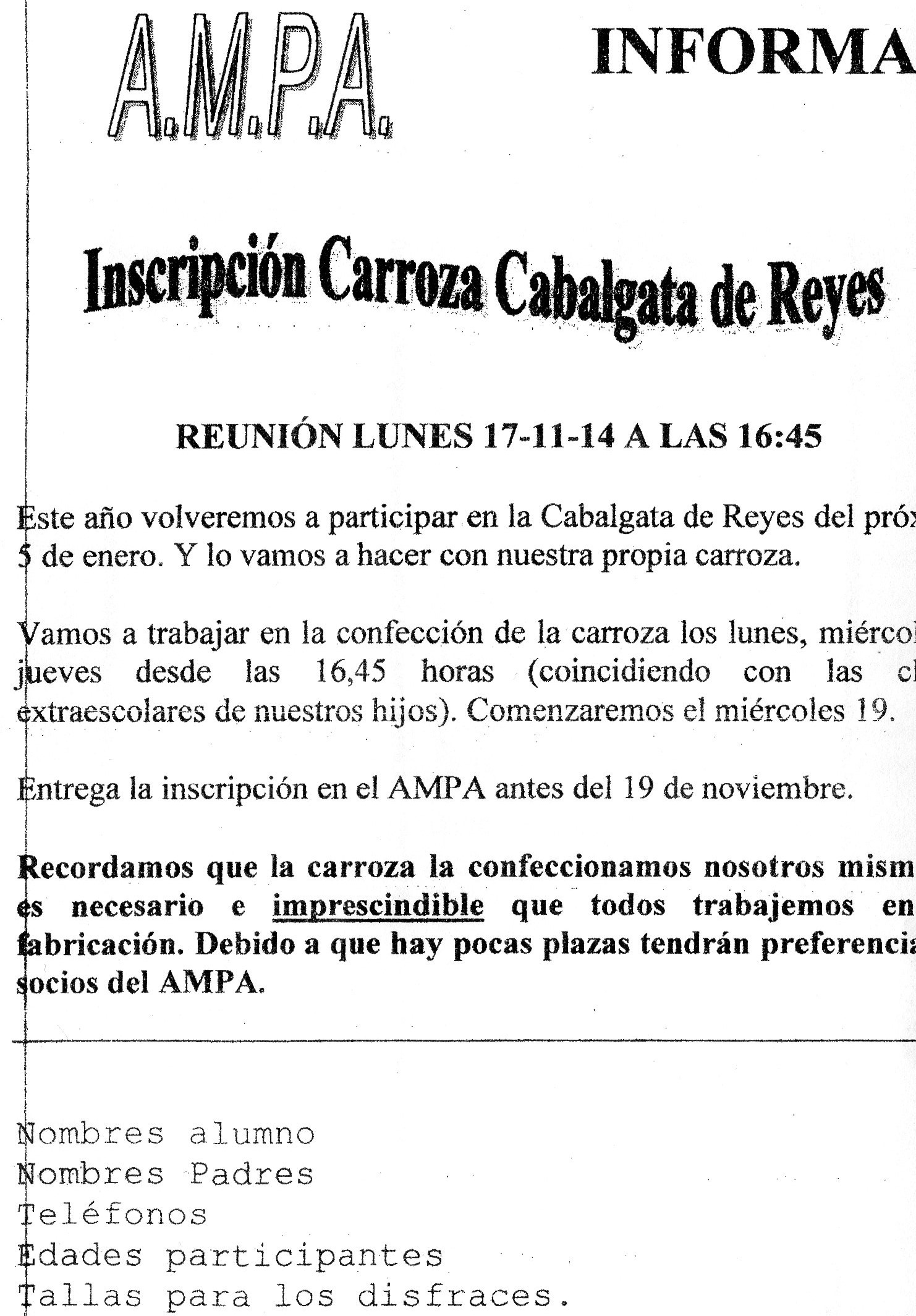 Recordamos que la carroza la confeccionamos nosotros mismos y es necesario e imprescindible que todos trabajemos en su fabricación. Debido a que hay pocas plazas tendrán preferencia los socios del AMPA.