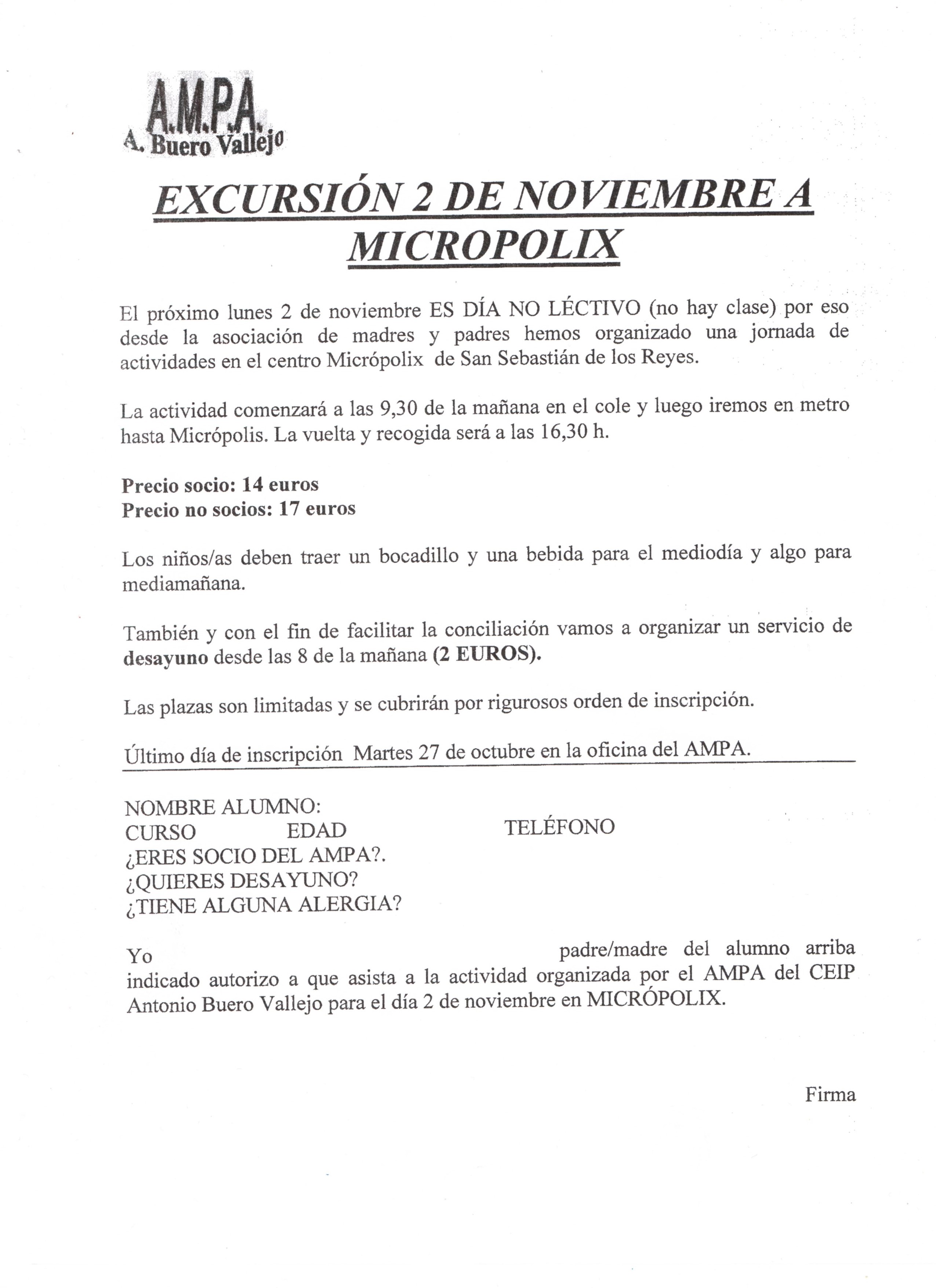 Las plazas son limitadas y se cubrirán por riguroso orden de inscripción. El último día de inscripción Martes 27 de octubre en la oficina del AMPA.