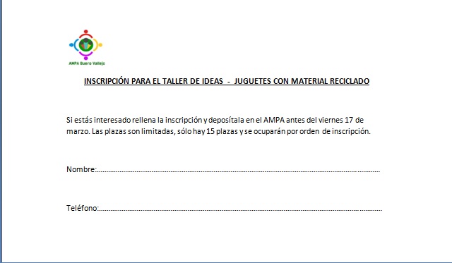 La hoja de inscripción (pinchar aqui), rellenar y entregar en el AMPA o depositar en el buzón. Plazas limitadas (15). Taller gratuito.