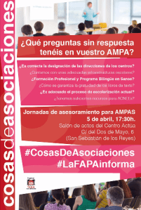 La Jornada, con el título: Cosas de Asociaciones. Jornada de asesoramiento para APAS , es el jueves 5 de abril a las 17:30 en el Centro Cultural Actúa, C/ Dos de Mayo nº 6, San Sebastián de los Reyes, Madrid.