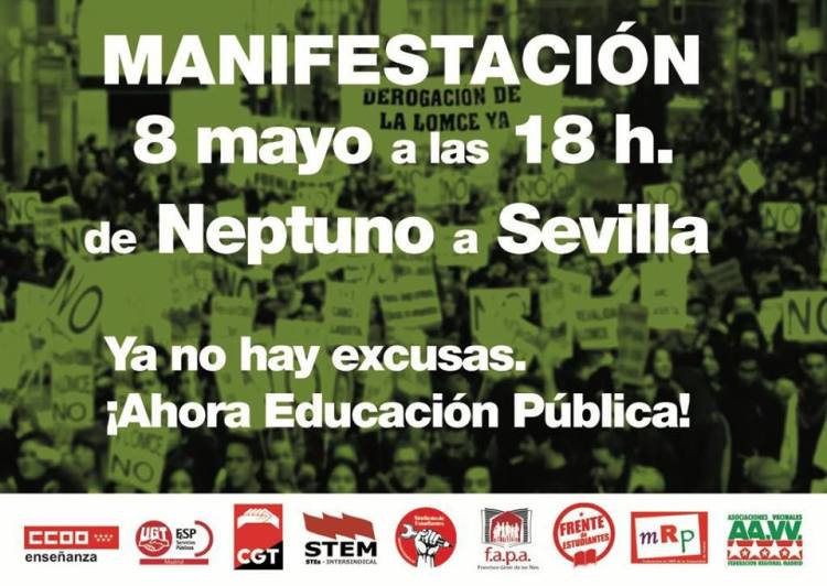 La FAPA Francisco Giner de los Ríos os invita y anima a participar, el próximo martes día 8 de mayo a las 18:00 h., en la manifestación de educación convocada en Madrid por la Plataforma Estatal por la Escuela Pública, de la cual forma parte, cuyo punto de partida será la Plaza de Neptuno, terminando en la estación de metro de Sevilla.