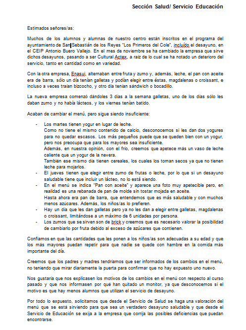 Debido a las numerosas quejas recibidas tras el cambio de la empresa encargada del programa municipal de los desayunos «Los primeros del cole», empeorando tras él tanto la calidad como la variedad de los alimentos que reciben nuestros hijos e hijas, desde la Junta Directiva del AMPA del BUERO se ha procedido a la redacción y presentación de un escrito en el Ayuntamiento, en el que recogemos todas las quejas y sugerencias que nos habéis hecho llegar las familias.