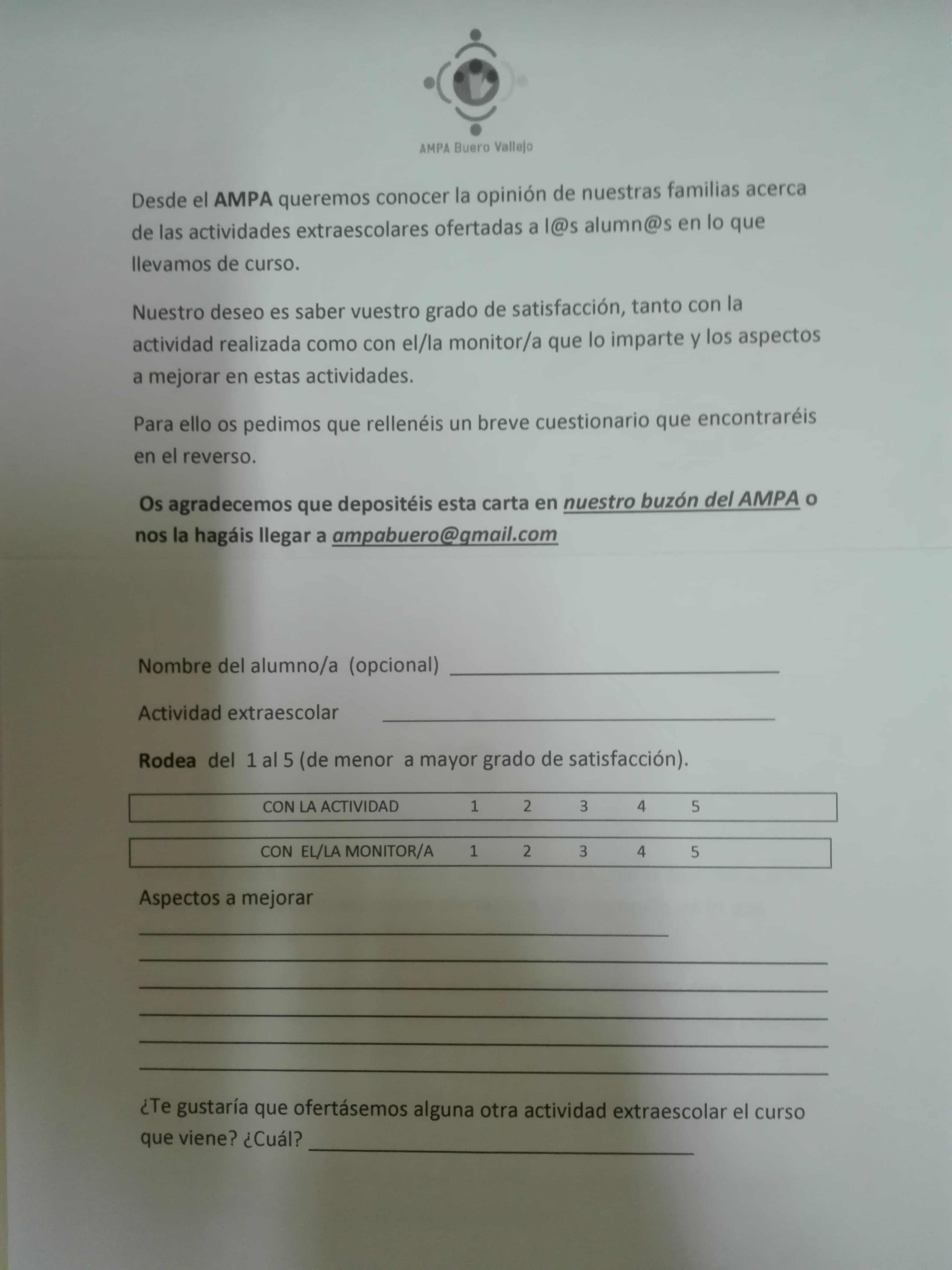 Podéis dejar esta encuesta en el buzón del AMPA o bien enviarla a ampabuero@gmail.com