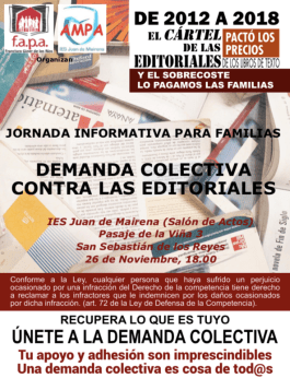 Os informamos de que el próximo martes 26 de Noviembre llevaremos a cabo una Jornada informativa sobre la Demanda Colectiva contra las editoriales que se ha puesto en marcha desde la FAPA Francisco Giner de los Ríos.