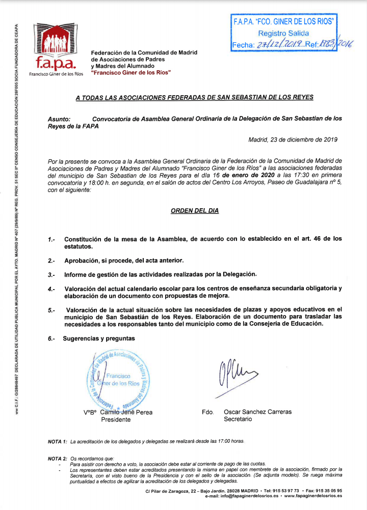 Convocatoria Asamblea FAPA Sanse, 16-1-2020