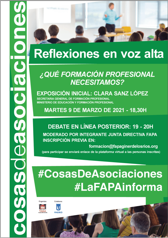 La FAPA Francisco Giner de los Ríos (de la cual nuestra AMPA es miembro) organiza una nueva jornada de formación online el próximo 9 de marzo, de 18:30/20:00 horas, bajo el nombre “¿Qué Formación Profesional Necesitamos?”.