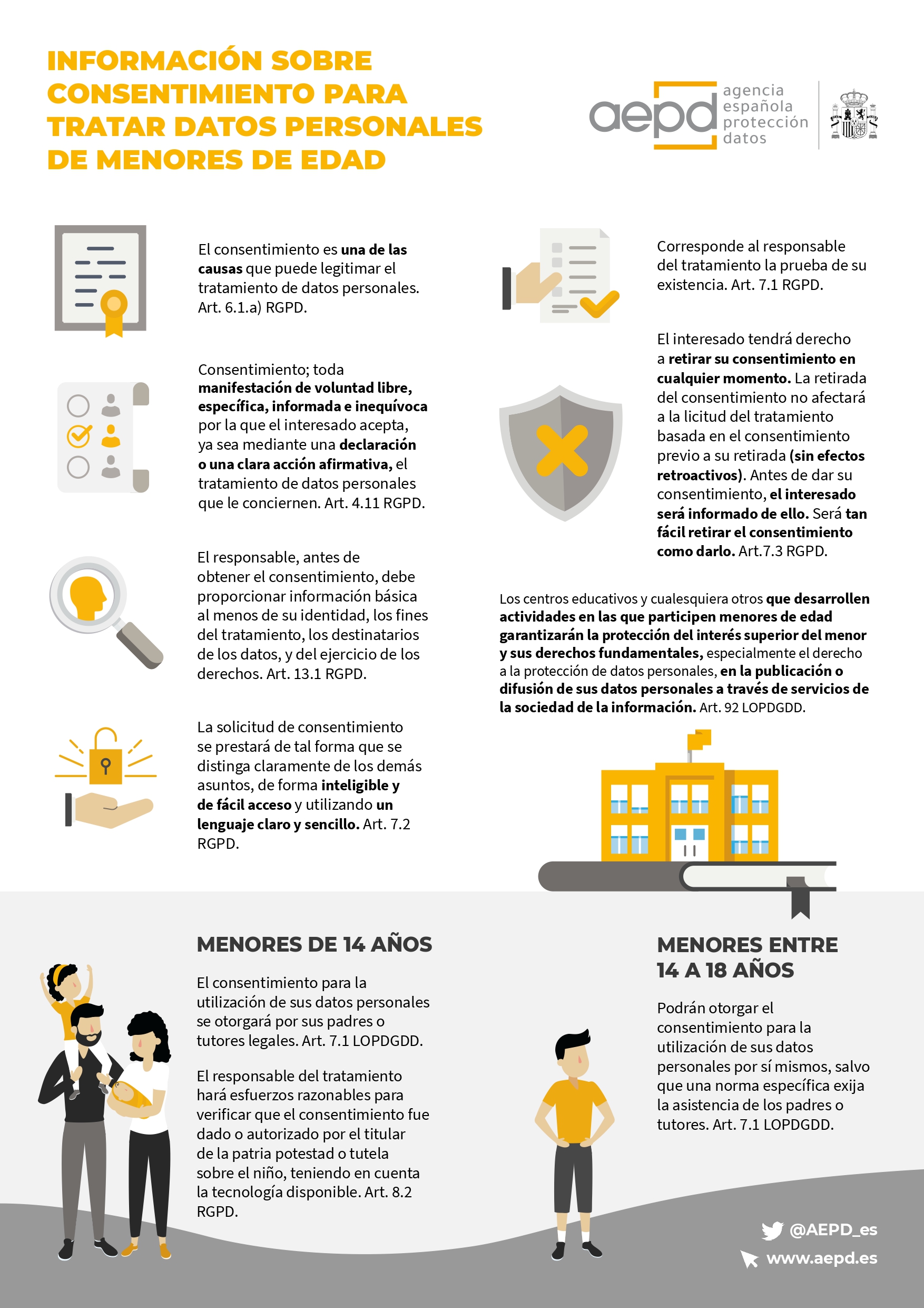 Y como información dirigida fundamentalmente a las familias, se ha publicado en su web una infografía donde se resumen cuestiones relativas al otorgamiento del consentimiento por padres y tutores legales, cuando éste sea la causa de legitimación para el tratamiento de datos personales de los menores: www.aepd.es/sites/default/files/2020-12/infografia-consentimiento-menores.pdf