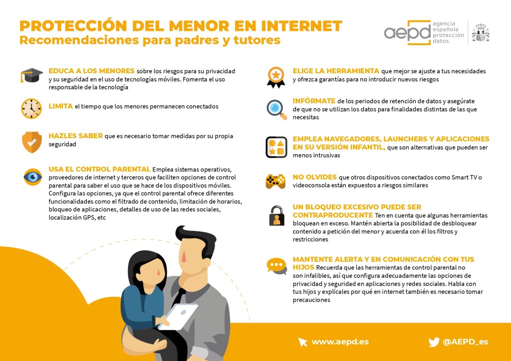 La Unidad ha publicado una nota técnica sobre Protección del menor en Internet – Evita el contenido inapropiado preservando su privacidad: www.aepd.es/sites/default/files/2020-04/nota-tecnica-proteccion-del-menor-en-internet.pdf. También han elaborado una infografía con recomendaciones para padres y tutores sobre este mismo tema: www.aepd.es/sites/default/files/2020-04/infografia-recomendaciones-proteccion-menores.pdf.