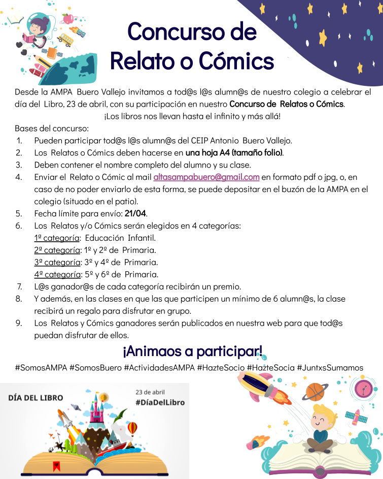 Desde la AMPA Buero Vallejo invitamos a tod@s l@s alumn@s de nuestro colegio a celebrar el Día del Libro, 23 de abril, con su participación en nuestro Concurso de Relatos o Cómics.
