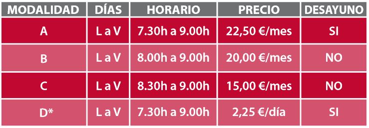 Para la modalidad «D» no se hacen pagos mensuales; solamente se abonan los días utilizados a los monitores al dejar a los niños por las mañanas. Por eso, animamos a que las familias hagan la inscripción en esa modalidad, por si en alguna ocasión necesitan utilizar eventualmente el servicio.