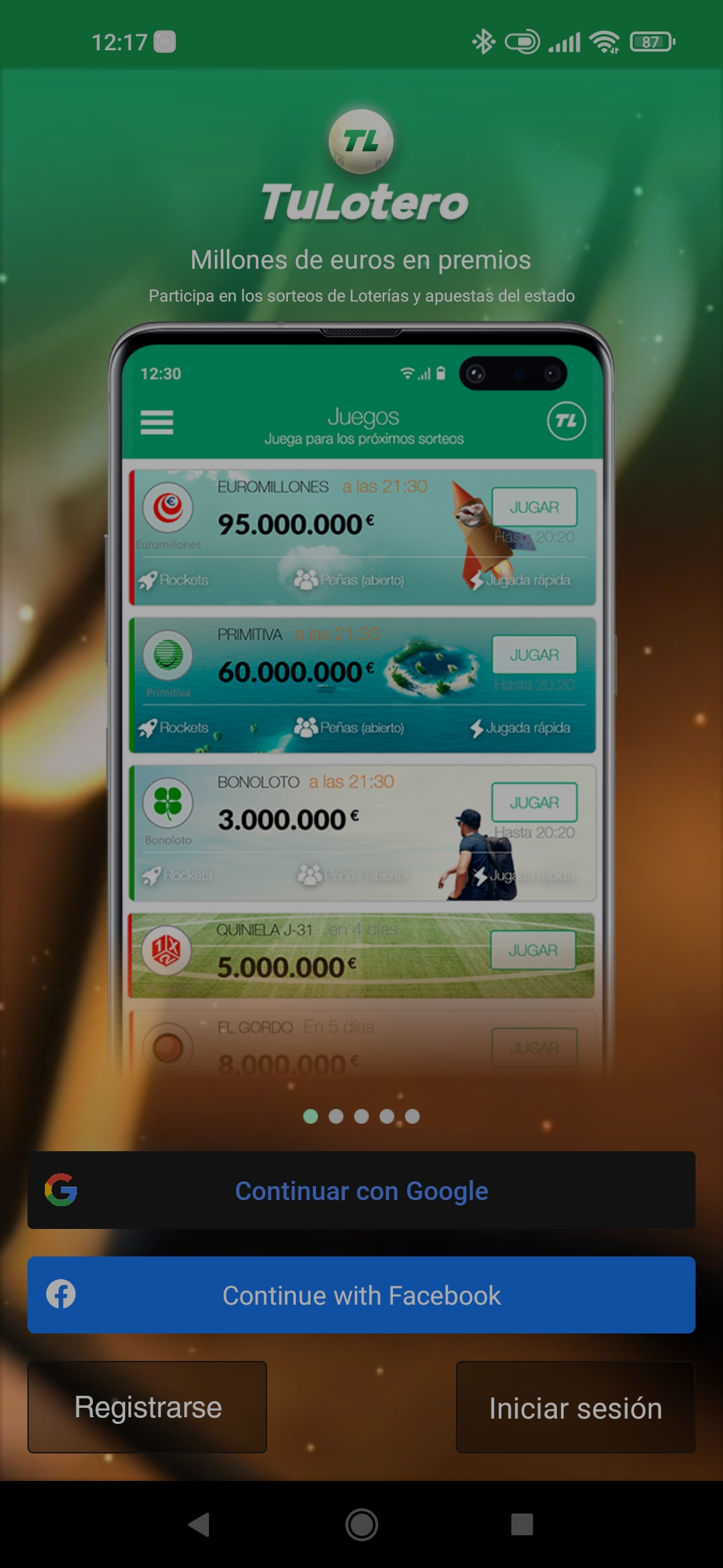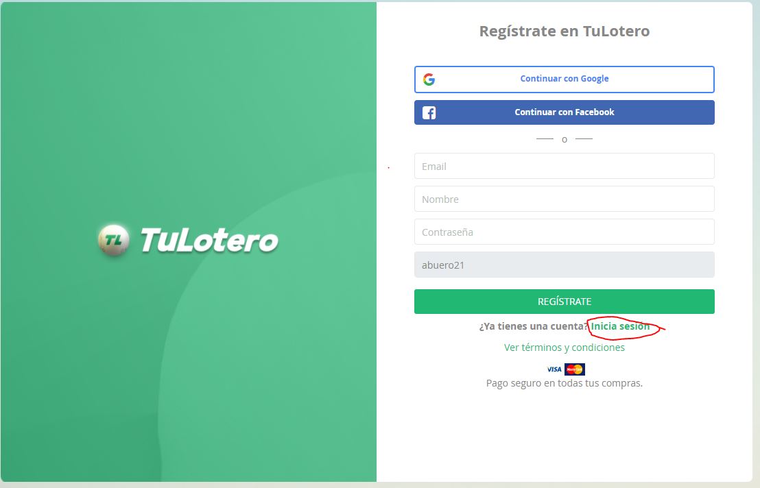 - Si aún no estás registrado en TuLotero.com, lo puedes hacer con tu cuenta de Google, Facebook o creando una cuenta propia en ese sitio. Si ya lo estás, pincha en «Iniciar Sesión»: