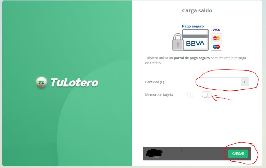 - Verificar la cantidad de nuevo y que no esté seleccionado «guardar la tarjeta». Pinchar en «CARGAR»: