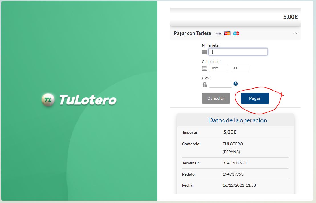 - Insertar lo datos de la tarjeta del banco. Pinchar en «PAGAR»: