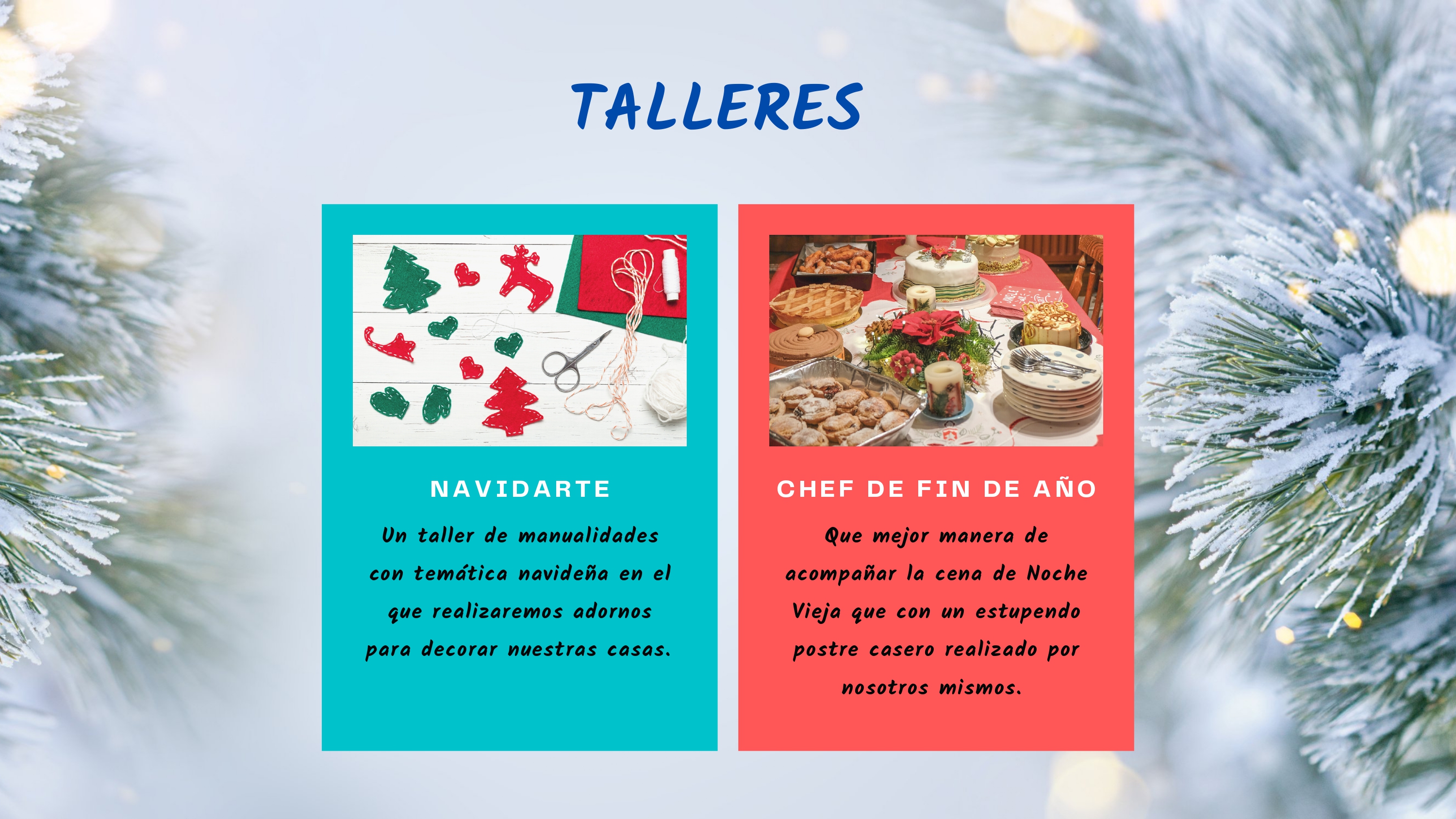 Este próximo 26 de Diciembre, de 11:30h a 13h, van a impartir un taller de artes navideñas: Navidarte. Y el 31 de Diciembre, de 11:30h a 13h ,van impartir un taller de cocina: Chef de Fin de Año.