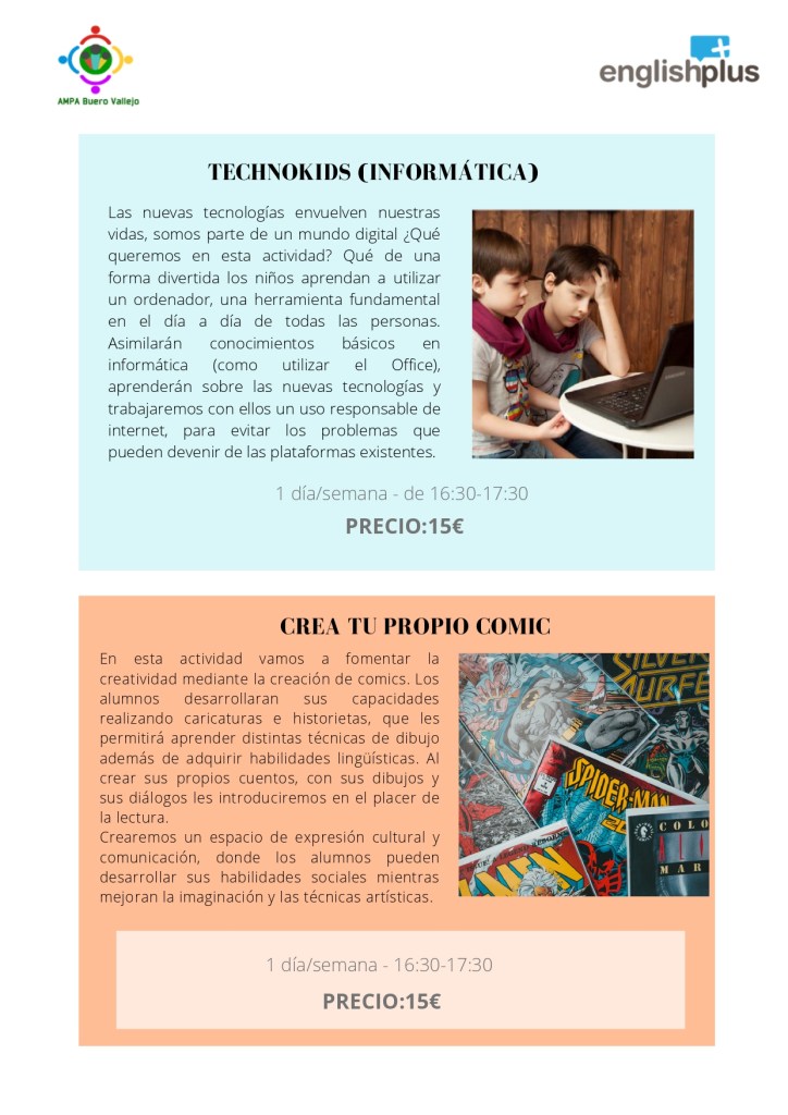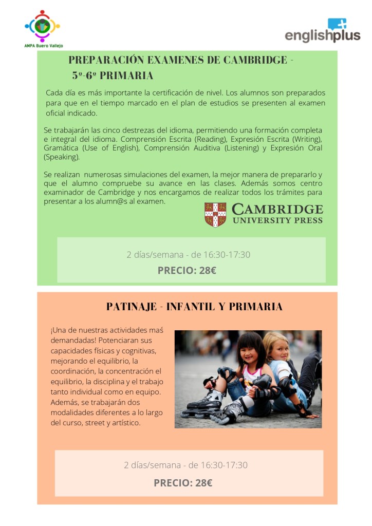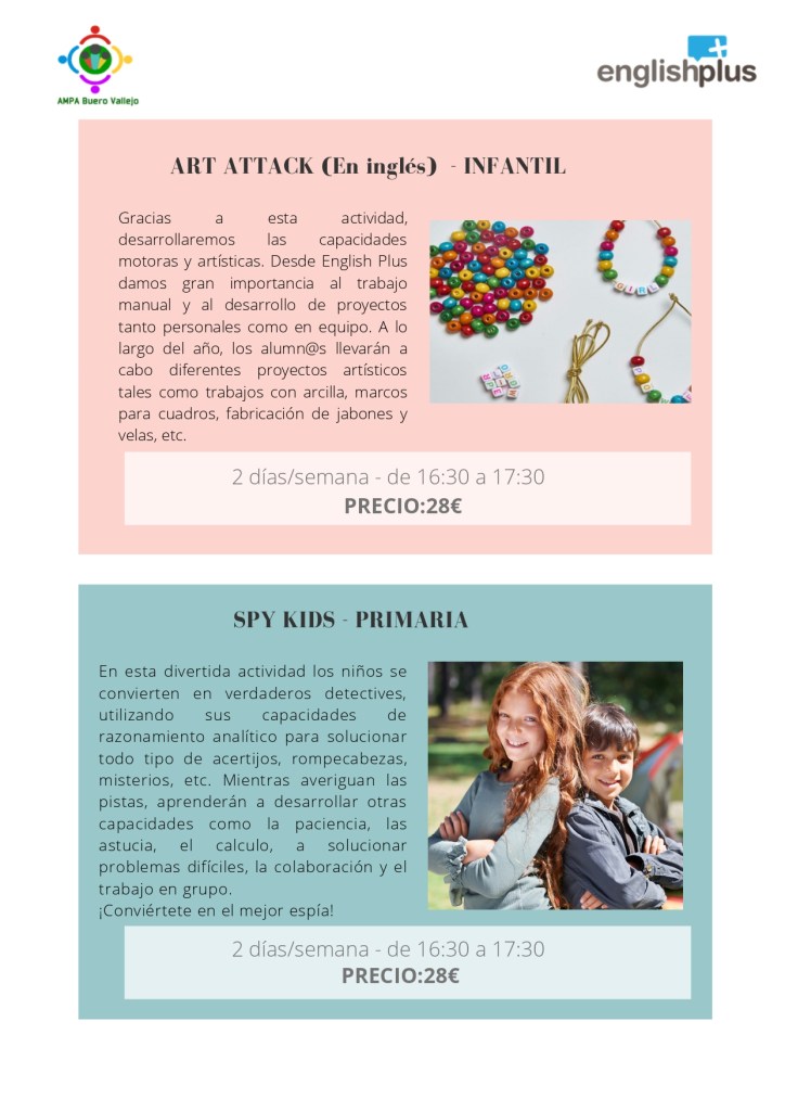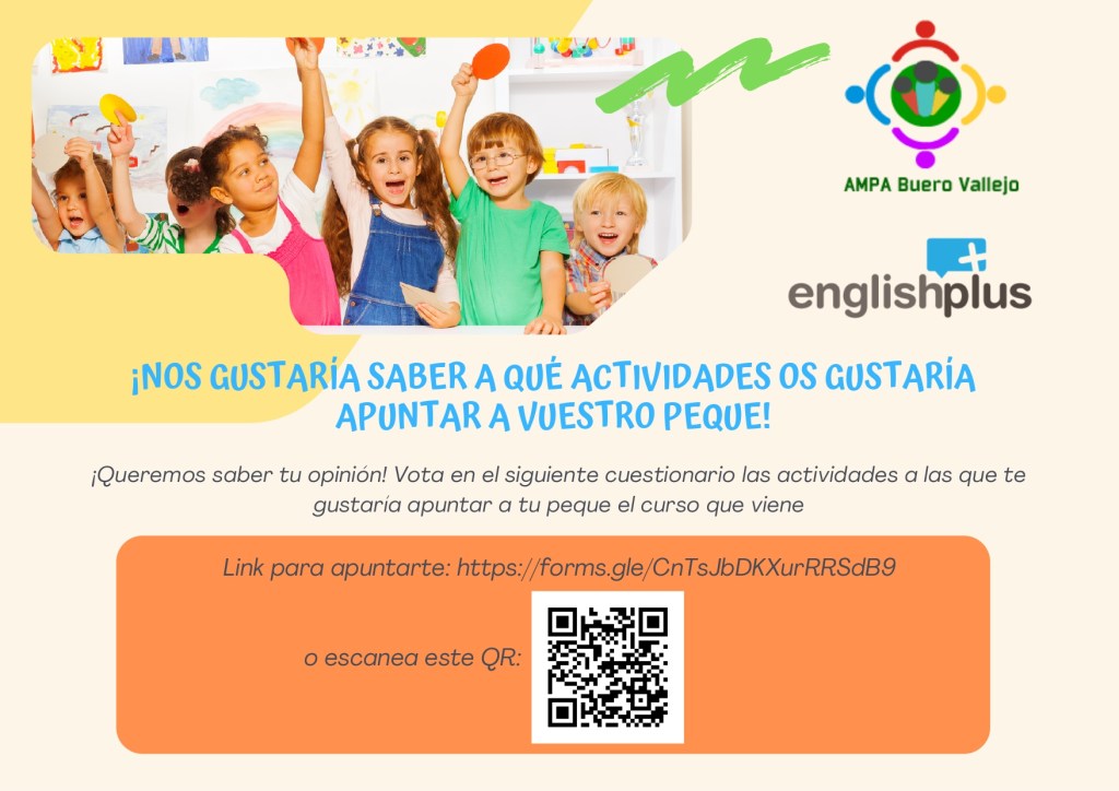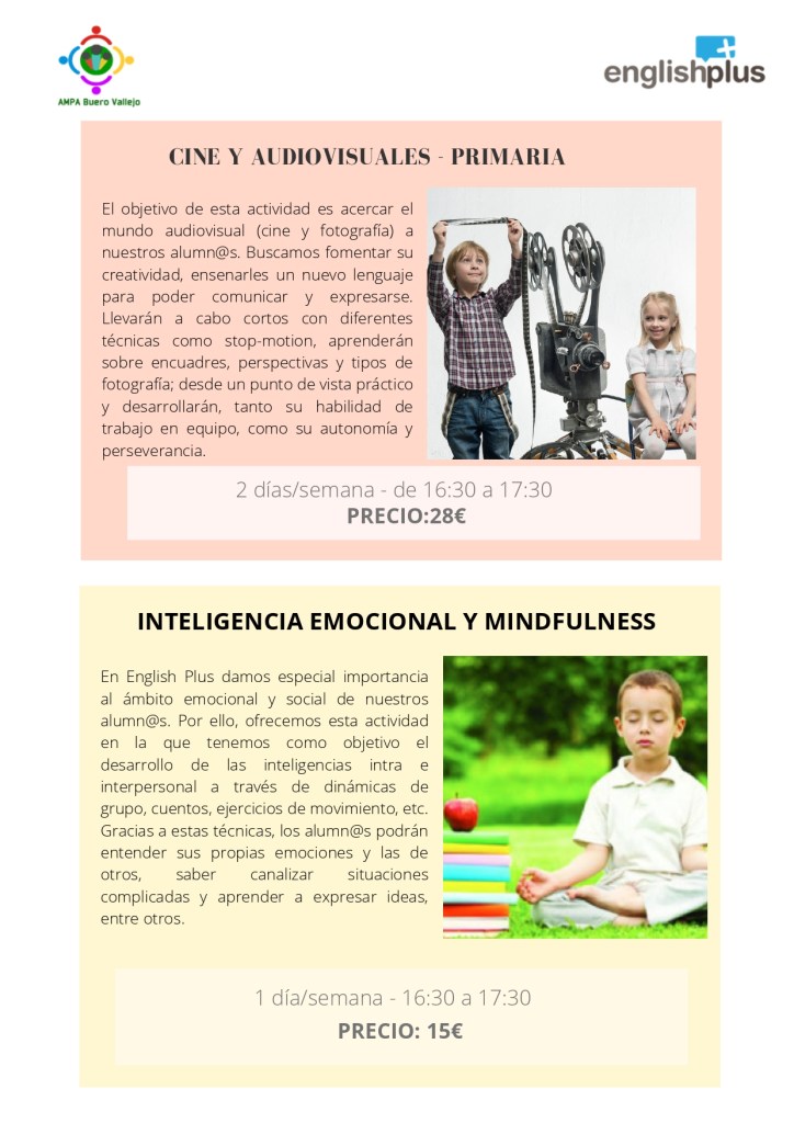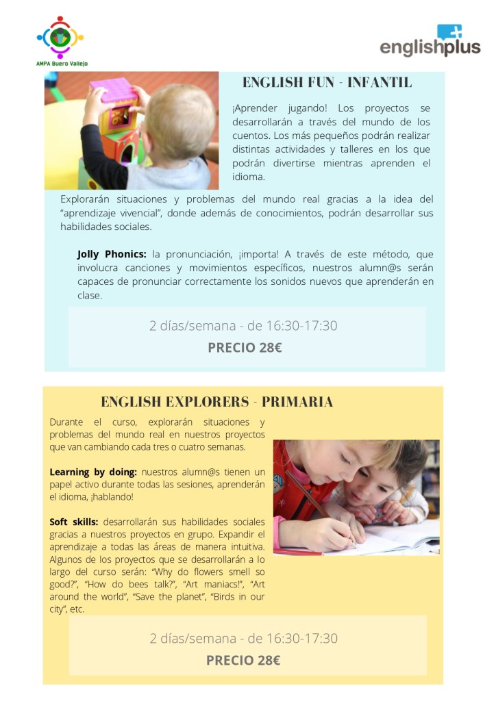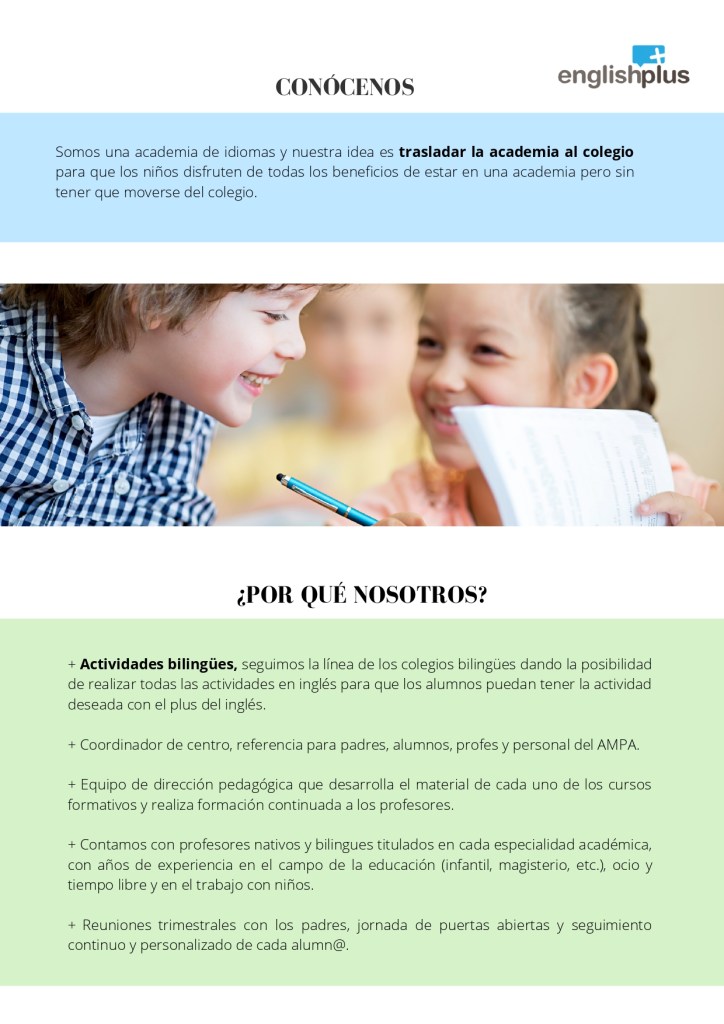 Hemos contactado con varias academias de inglés, evaluado sus programas y coste. Tras dicha evaluación nos hemos decido por la ‘Academia EnglishPlus ‘ que nos propone colaborar en algunas de las actividades extraescolares junto con el equipo directivo para trabajar, coordinar contenidos y/o refuerzos.