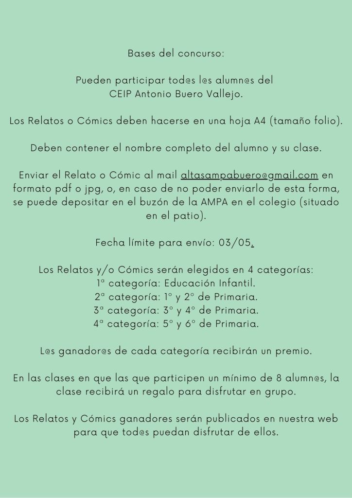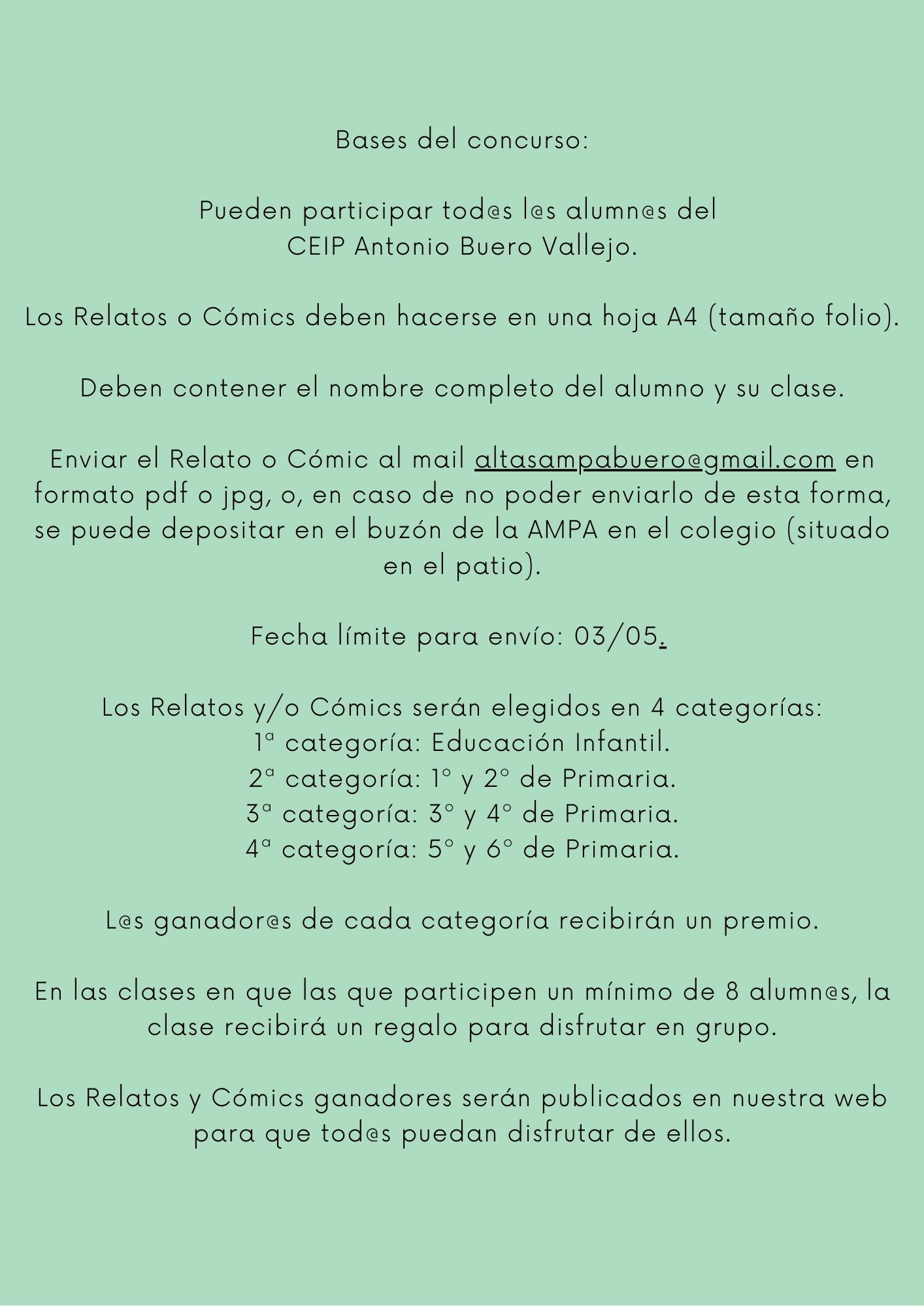 se podrá elegir entre comic o relato, debe realizarse en formato PDF o JPG, tamaño A4 (folio), deberá enviarse por mail : altasampabuero@gmail.com, o bien se podrán depositar en el buzón del AMPA que está situado en la puerta de la oficina en el patio.