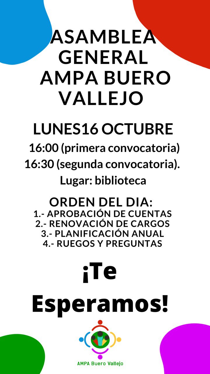 El próximo lunes 16 de octubre, a las 16:00 horas en primera convocatoria, la AMPA os invita a participar a todas las familias del Buero en la ASAMBLEA GENERAL DE MADRES Y PADRES, con el siguiente orden del día: