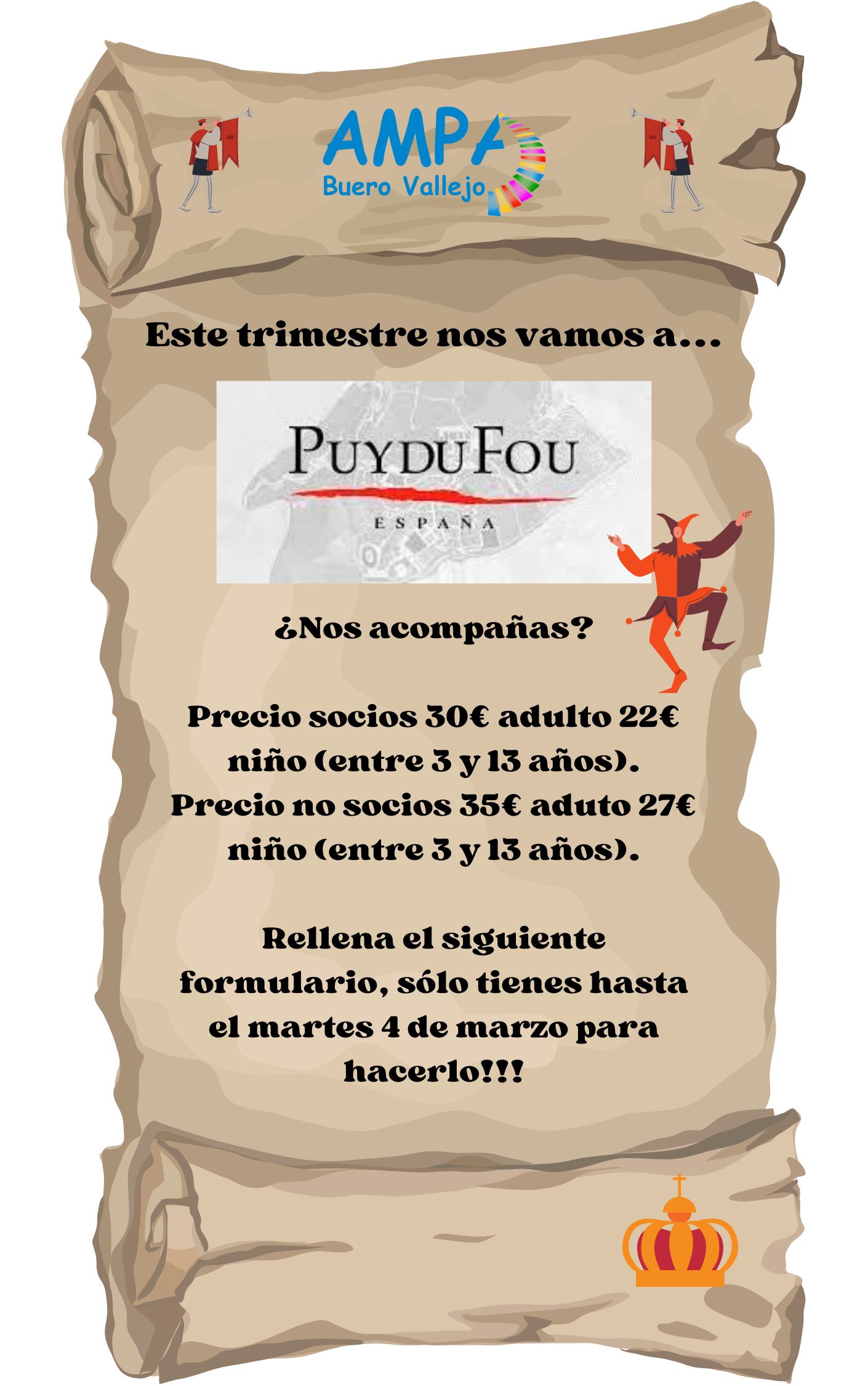 Entra aquí (hasta el 4 de marzo), indícanos cuántas entradas quieres y abona el importe bonificado en la cuenta del AMPA (ES92 2100 6093 6913 0054 2564). Recuerda adjuntar el justificante de la transferencia y enviarlo por mail a ampabuero@gmail.com para hacer efectiva la solicitud.