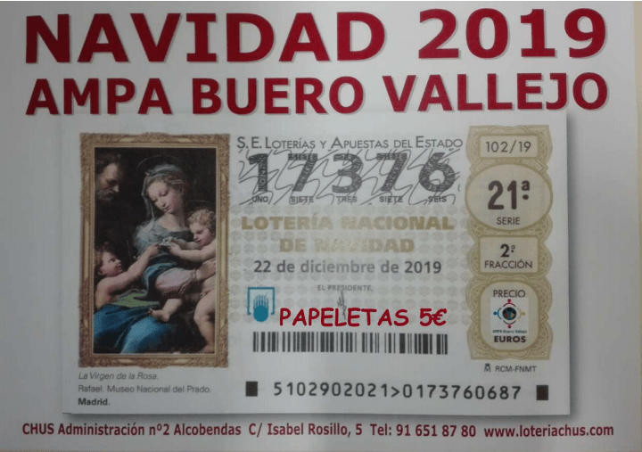 ESTIMADAS FAMILIAS: YA TENEMOS A LA VENTA LA LOTERÍA DE NAVIDAD DEL AMPA, EN LA QUE JUGAREMOS CON EL NÚMERO 17.376. LAS PAPELETAS TIENEN UN PRECIO DE 5€, JUGÁNDOSE 4€ Y EL EURO RESTANTE SERÁ COMO DONATIVO, QUE SE DESTINARÁ A LA COMPRA DE MATERIAL ESCOLAR Y A ACTIVIDADES ORGANIZADAS POR EL AMPA. ESTÁN DISPONIBLES EN SECRETARÍA Y ENSigue leyendo «Lotería de Navidad 2019»